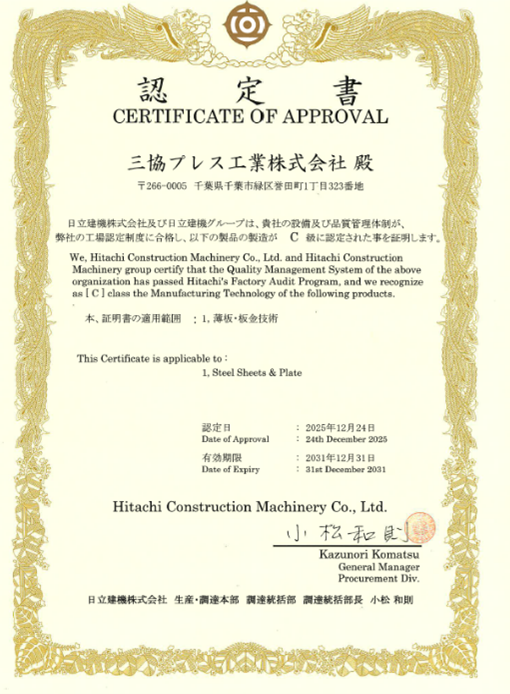 弊社は設備および品質管理体制が日立建機株式会社および日立建機グループの工場認定制度に合格し、薄板・板金技術を用いた製品の製造においてC級に認定されました。今後もさらに上位を目指し、技術および品質管理体制の向上に努めてまいります。
